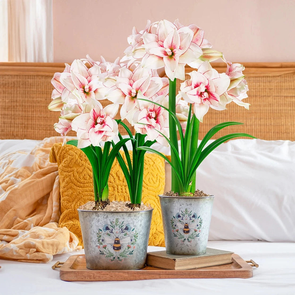 Let nature do what it does best—uplift and inspire. This immensely charming bulb gift features the beloved Elvas Amaryllis, a pink-and-white standout prized for its lush, fully double blooms and easygoing nature. Large, long-lasting flowers—some reaching an impressive 8-10" across—rise gracefully on sturdy stems and begin to bloom in about 6-8 weeks, putting on a show that feels both special and effortless.