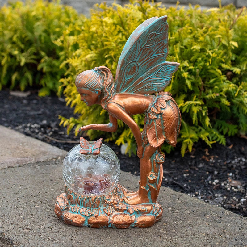 This adorable yard art is designed to look like it's made of patinated copper but is actually crafted from durable resin. This figurine's crystal ball lights up at nightfall. The orb, which resembles an elegant portion of cracked ice, contains a beautiful butterfly that has captured the friendly fairy's attention.