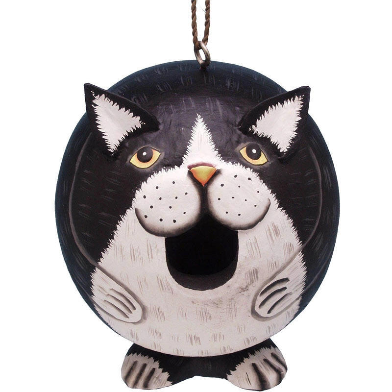 At first glance, this whimsical birdhouse looks likeanything BUT a safe haven for your feathered yard visitors!Craftedfrom natural and nonpoisonous components, it resemblesa rotund pussycat waiting for its next meal to haplessly fly into its waiting mouth. This birdhouse ishand carved from albizia wood,a fast-growth renewable resource, and hand painted with nontoxic paints and finishes.A coating of polyurethane protects the materials from the elements, and a trap door allows for easy cleaning.Comes ready to hang. (5½"h, 5½"w, 7"d)