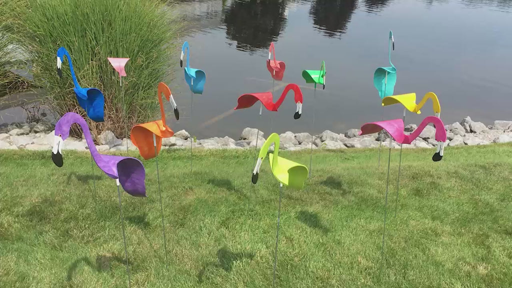 There's no mistaking this bird for anything other than a graceful and colourful flamingo that occasionally enjoys busting a move! A special hinge lets this hand-crafted bird pivot, dip and dance elegantly atop its 35" galvanized stake anytime a light breeze comes along. Made from tough, ultraviolet light-resistant PVC, this decorative and durable garden décor is built to withstand day-to-day changes in the weather. When the conditions turn more severe or the temperatures become more extreme, the bird can be easily lifted off its stake and taken inside. Hand painted and hand shaped in the USA. (bird: 24"h, 6½"w, 6"d; stake: 35" long)