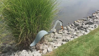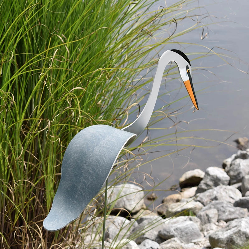 Few birds are as majestic as the Great Blue Heron, and this one would also look pretty good hanging out in your yard or garden. A special hinge lets this hand-crafted bird pivot, dip and dance elegantly atop its 35" galvanized stake anytime a light breeze comes along. Made from tough, ultraviolet light-resistant PVC, this decorative and durable garden décor is built to withstand day-to-day changes in the weather. When the conditions turn more severe or the temperatures become more extreme, the bird can be easily lifted off its stake and taken inside. Hand painted and hand shaped in the USA. (bird: 24"h, 6½"w, 6"d; stake: 35" long)