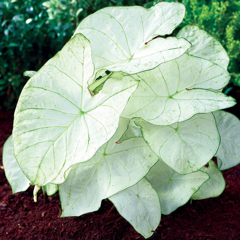 Brighten darkened corners of your garden with silvery-white leaves that seem to capture moonlight itself. Florida Moonlight Fancy Leaf Caladium’s heart-shaped foliage creates a luminous display, reaching up to 18" in height with a similar spread. These tropical stunners add ethereal beauty everywhere they can be used. Their vigour and ghostly grey-white colour make them natural choices for brightening dim areas beneath tree canopies or lending drama to container arrangements.