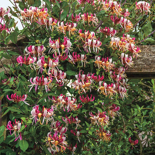 Here is a honeysuckle vine that transforms any fence or trellis into a blossoming haven. From the ground up, dark red buds release an abundance of rich crimson flowers with white-and-cream throats. The small, tubular blooms emit a strong, very sweet scent that brings in butterflies and hummingbirds. After the flowers fade, Fragrant Cloud bears a feast of bright red berries that feed sparrows, goldfinches and other birds.