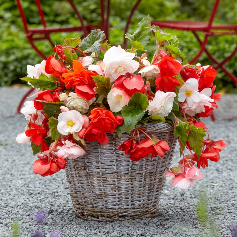 Camellialike double blooms in fire-engine red and pink-blushed white spill from baskets and containers with weeks of sweet fragrance. Extremely prolific plants keep the colour coming all summer to first frost, with very full, ruffled flowers reaching up to 7" across. A lively choice for patio pots, hanging baskets and lightly shaded front borders. Varieties are not individually labeled.