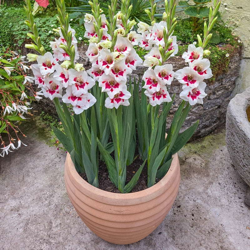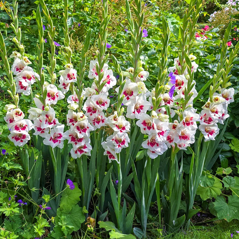 Striking clean white petals spotlight a bold fire-engine red heart for sharp contrast that reads from across the garden. Perfectly formed 4" florets line one side of robust stems, giving this an excellent upright habit for borders, group plantings and cutting gardens. A true pollinator magnet, the blooms draw butterflies and other beneficial visitors all season. For a longer display, divide plantings of this gladiolus about 7–10 days apart.