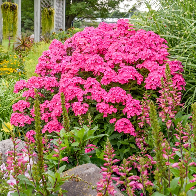 Hot coral pink flowers, softly aging to light coral, crown dark purple stems on upright plants about 32" tall. Throughout summer, this standout phlox delivers big, colourful panicles that pull in bees and butterflies while staying remarkably clean and green, even in hot, humid weather. One of the most mildew-resistant varieties available, Glamour Girl keeps its fresh look when others falter. Quick deadheading brings on repeat blooms for an extended show.