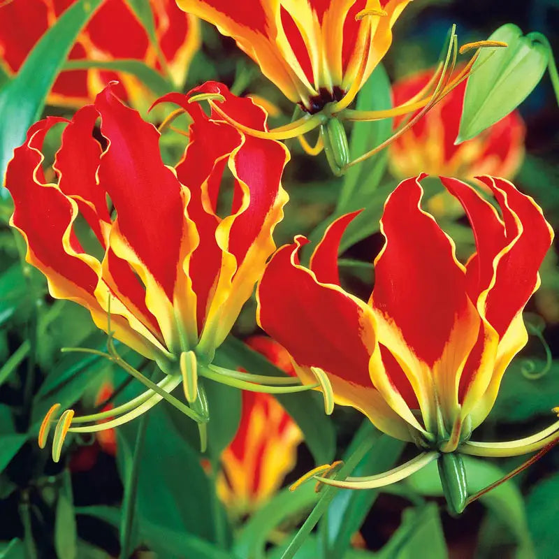 Also known as Flame Lily, award-winning Gloriosa features a fiery colouration of vibrant red with yellow brushstrokes. The blooms cover a strong climbing vine that should be trained up a trellis or arbor to stay upright. Nearby admirers will enjoy its light, slightly sweet scent. A fantastic choice for anchoring a sunny border or cutting bed.