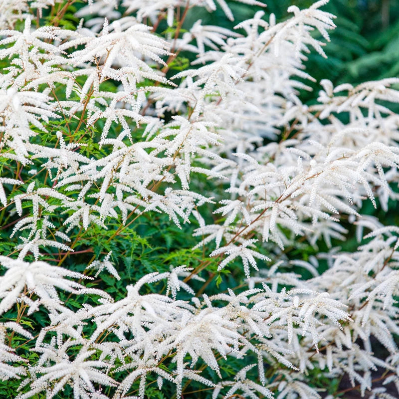 Its feathery wands create a dynamic display, always appearing to be in motion even when at rest! When they arrive, these densely packed, creamy white plumes seem to float above the plant. Its low-growing base showcases medium green, finely cut, fernlike foliage.