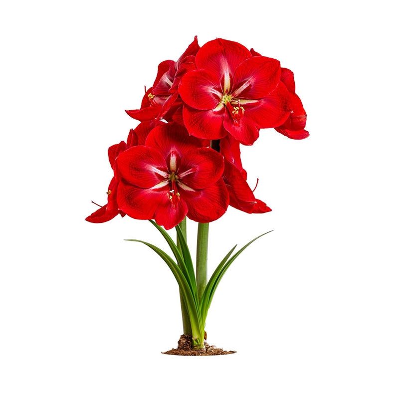 Happy Grandise is a standout choice for adding festive splashes of red and white where needed. Each large, deep red bloom, measuring 8-9" across, features a striking white, star-shaped centre and stands tall on robust stems reaching up to 24" tall. Native to South America, the amaryllis thrives indoors during winter, brightening up those shorter days with its radiant flowers. Bulbs produce one or two stems, each yielding 2-5 flowers. Within 8-10 weeks of planting in a decorative pot, you'll enjoy this plant's impressive display. When the frost has passed, move it outdoors to a partially sunny spot or plant it in your garden for summer blooms. It makes a thoughtful holiday gift for a relative, friend or teacher. Ships as a 26-28 cm bulb.