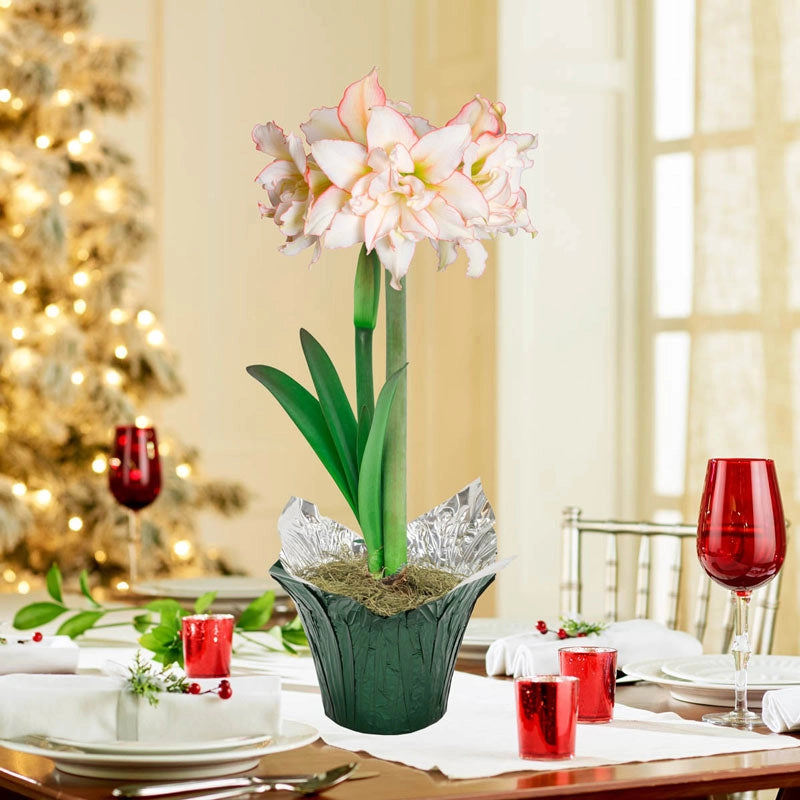 Gift your friends and loved ones with reminiscences of the season with our new pre-potted Harlequin Amaryllis bulb. Paired with a festive foil-wrapped nursery pot, Harlequin is sure to spark joy in the hearts of many this season, and for years to come. Big, fully double white blooms erupt from the pot 6-8 weeks after arrival, ready to show off finely trimmed, pink edges. A beloved holiday tradition in the making. Includes detailed blooming instructions. EXCLUSIVE (Single: 6¼"h, 6¼" dia. Triple: 7¼"h, 9½" dia.)
