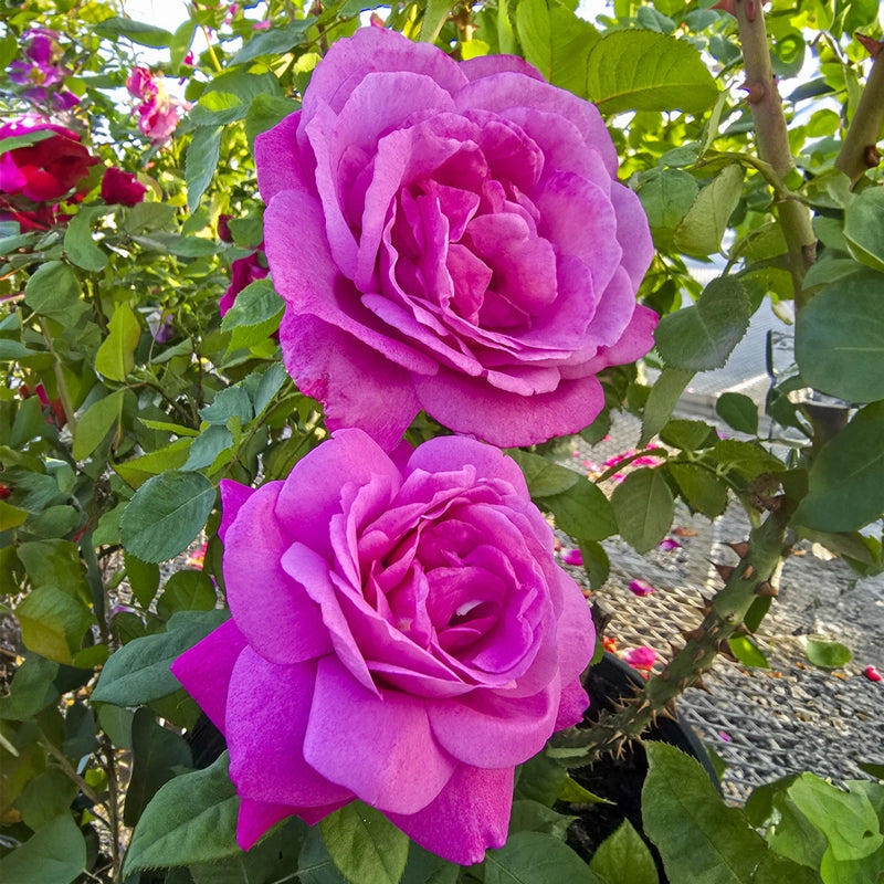 A profusion of lilac and lavender blooms gives this hybrid tea rose timeless charm. Heirloom’s pointed buds unfurl into 4–5" semi-double flowers with 30+ petals and a fragrance blending apple, wine and ripe raspberries. The blossoms appear singly or in clusters on strong, dark green stems ideal for cutting. A vigorous rebloomer with good disease resistance, this slightly spreading, rounded plant shows its richest colour in cooler weather.
