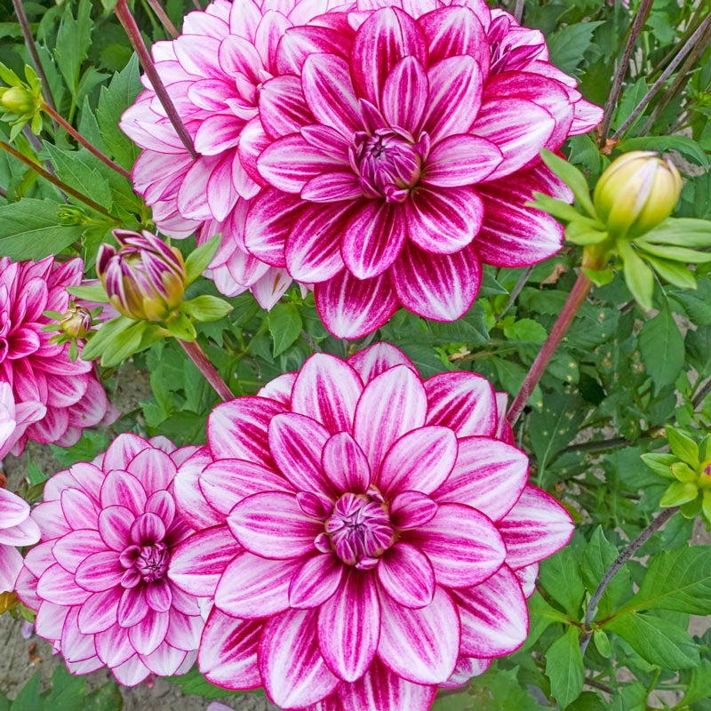 You’ll be captivated by its striking 5½" fully double blooms, showcasing a mesmerising colour fusion. Outer petals boast a white base adorned with a reddish-pink overlay and delicate white veins, while inner petals echo this design with subtle pinkish-red edges. A truly unique, one-of-a kind dahlia!