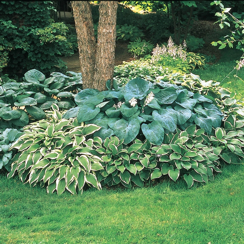Luxurious beauty for shade. Rich green foliage, heart shaped to nearly round, spreads 20–60". Mildly fragrant purple or white blooms. Varieties are not individually labeled.