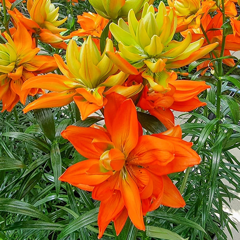 This double lily undergoes a remarkable transformation, bursting onto the scene with lush green blooms that mature into vibrant orange spectacles. These pollen-free, roselike flowers measure an impressive 5" across, their upward-facing petals unfurling in layers of sumptuous colour. Perfect for adding drama to borders Phase 2 Hulk Double Lily or creating showstopping bouquets, Hulk offers lasting beauty both in the garden and as a cut flower. Plant it along a garden path to showcase its metamorphosis.