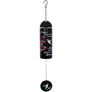 "A house is made of walls and beams. A home is made of love and dreams." This sweet sentiment is UV printed on a steel cylinder that offers pleasing sounds when breezes blow. A vibrant ruby-throated hummingbird hovers amid the verse. Makes a great wedding or housewarming gift. (22"l, 3" dia.)