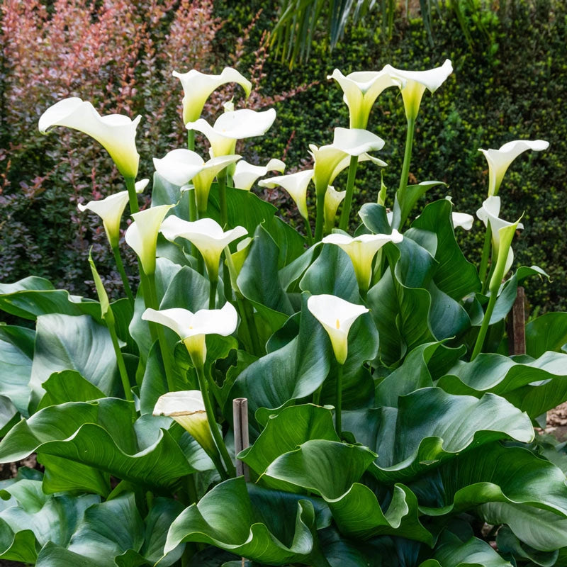 Large, pure white blooms with a yellow spadix rise gracefully from a ring of glossy green leaves. Aethiopica is the crème de la crème of the calla lily world. Specially selected for their intense flower production, these gems deliver endless colour and fragrance all season long. Perfect for beds and borders, these are especially suitable for patio containers due to their highly desirable free-flowering habit. The flowers are also lovely in bouquets and fresh-cut floral arrangements.