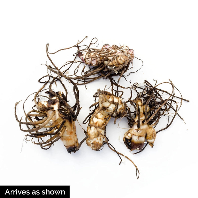 Ideal for patios and small gardens, this award winner reaches just 30–32" tall yet delivers weeks of vivid colour from early summer until the first frost. Large, flared blooms in glowing coral-red to orange rise above strong, upright stems and are beautifully set off by broad, tropical leaves in deep green flushed with bronze. The dramatic foliage–flower contrast makes a striking statement in containers and tight planting spaces. Sturdy and weather resistant, the plants also deter deer and rabbits while attracting butterflies and hummingbirds. An RHS Award of Garden Merit winner in 2003, Ingeborg performs best in full sun. Lift and store the rhizomes in zones 3–7 for winter protection.