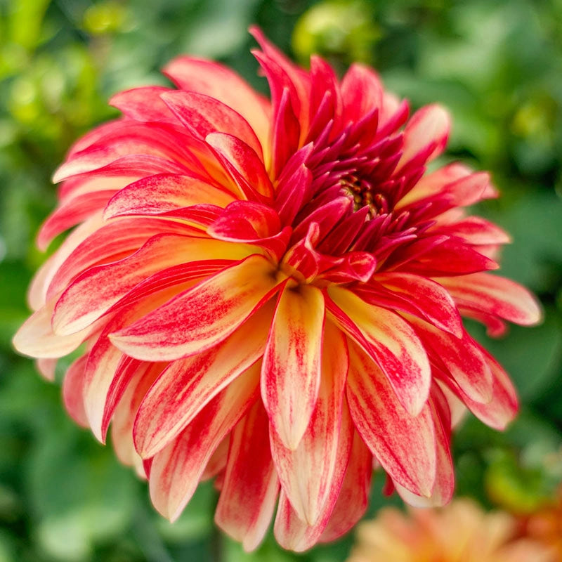 Presenting a prolific and colourful dahlia that is equally stunning whether on display in a vase or standing tall in the garden. Irish Pinwheel produces a number of robust, 40" stalks that carry many lush, fully double blooms. The 5" wide flowers are soft gold and brushed cherry red with curved petals that give them the appearance of a child's pinwheel toy. Great for adding texture and pops of colour to the rear of a border!