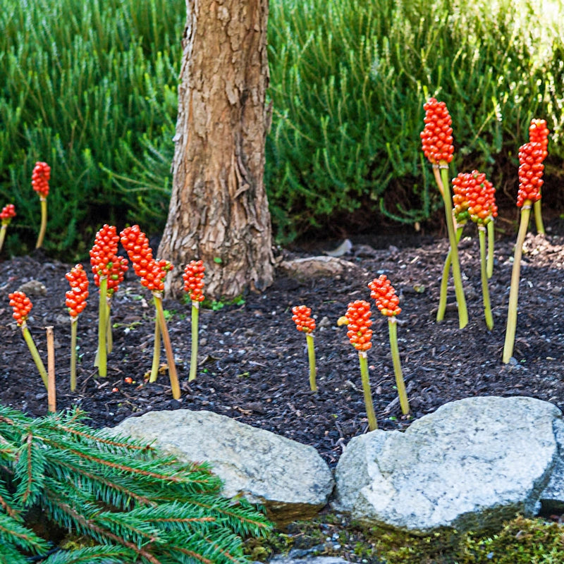 Green blooms, similar to jack-in-the pulpits, appear in early summer, followed by small clusters of orange red berries. Arrow shaped foliage becomes marbled and silver veined in the fall. Add this jewel for variety in your garden.