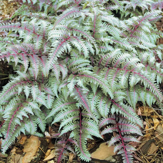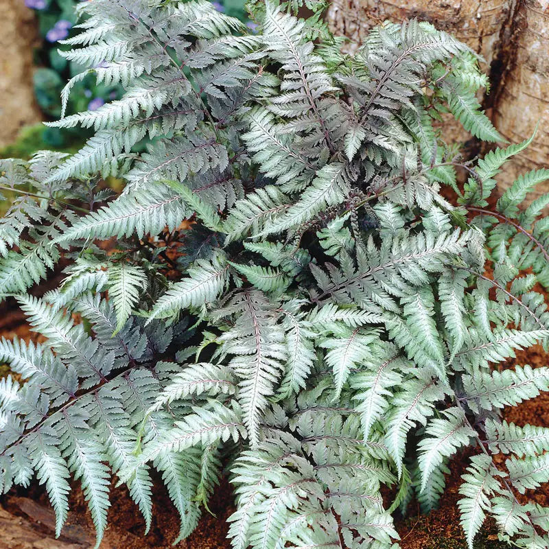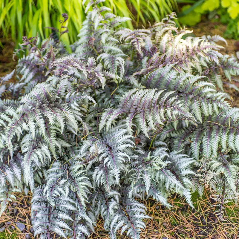 Here’s a uniquely hued fern that truly loves living in shade, making it ideal for woodland or shade gardens filled with trees and shrubs. Its triangular, variegated fronds of grey-green have hints of silver and dark maroon midribs—colouring that gives the foliage a striking metallic sheen.