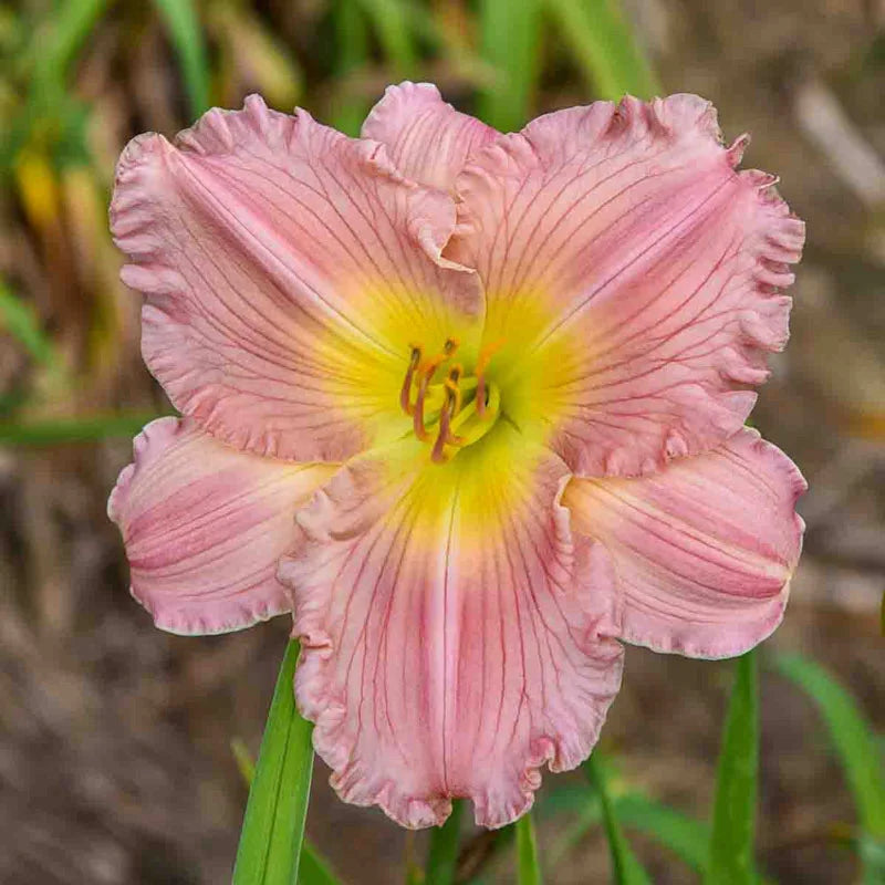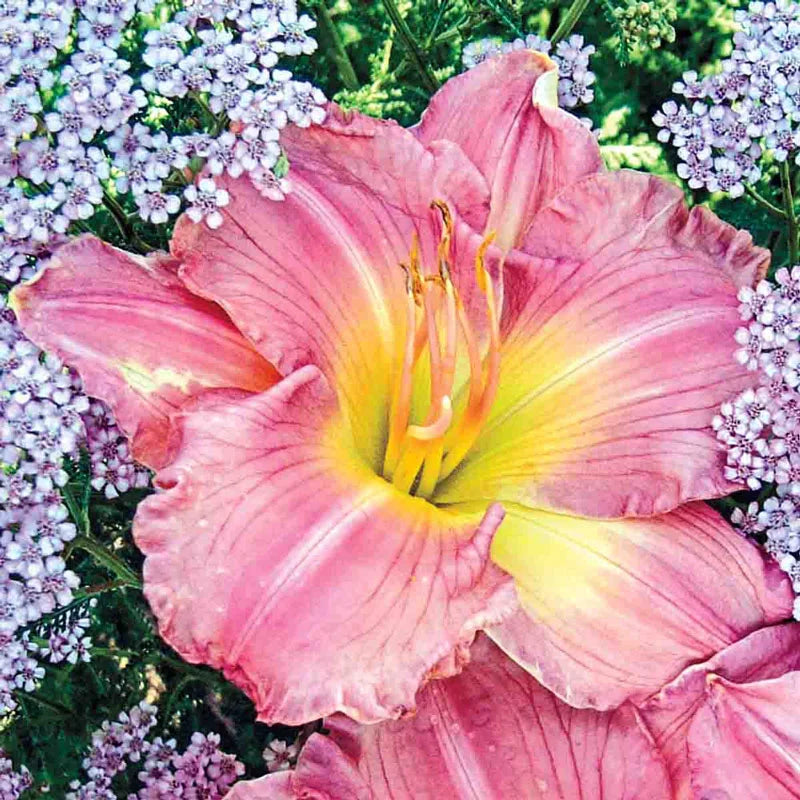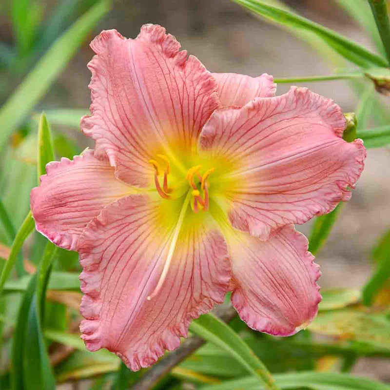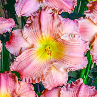 A top pick for front borders, this historic daylily shows off big, 6" wide flowers on compact scapes. Deeply ruffled petals in warm pink feature rose veining, a golden-yellow eye and pale green throat. Its evergreen foliage adds year-round appeal.