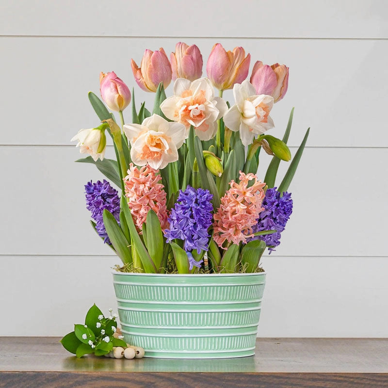 Gift that special someone a treat for the senses with a tantalizing display of sumptuous peach tones and pops of pretty purple. Perfect for any occasion, it features four Dutch imports in coordinating soft shades and a heady springtime perfume. Includes 5 Salmon Prince Tulips, 3 My Story Narcissus, 2 Gypsy Queen Hyacinths and 3 Blue Star Hyacinths. The elegant light green metal pot features a delicate white-washed motif that sets off this colorful spring garden quite nicely. A fantastic Mother's Day or spring birthday offering! 13 bulbs total. EXCLUSIVE. (4½"h, 8¾" dia.)