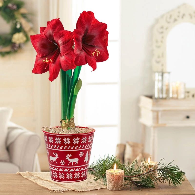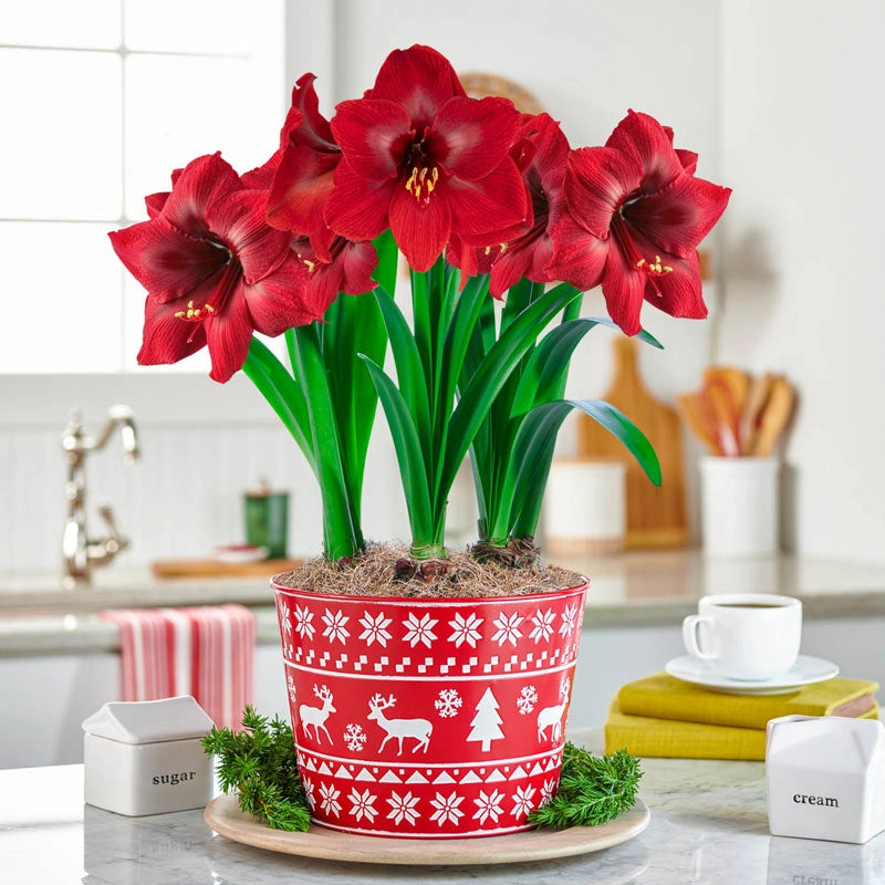 A recent addition to our Amaryllis Lovers™ lineup, Karoo features broad, 7", deep crimson blooms that contrast beautifully with its lush green foliage and bright yellow stamens. The blooms sit prettily upon 12-16" stalks and give any indoor décor a pop of rich color. Makes a fantastic gift for Grandma, a favorite teacher or cherished friend. Bulbs come pre-planted in a red and white metal pot with festive embossed design. This versatile container can be repurposed to hold mail, rolled hand towels, pantry items and more. EXCLUSIVE. (Single: 6"h, 6¼" dia.; Triple: 7"h, 9½" dia.)