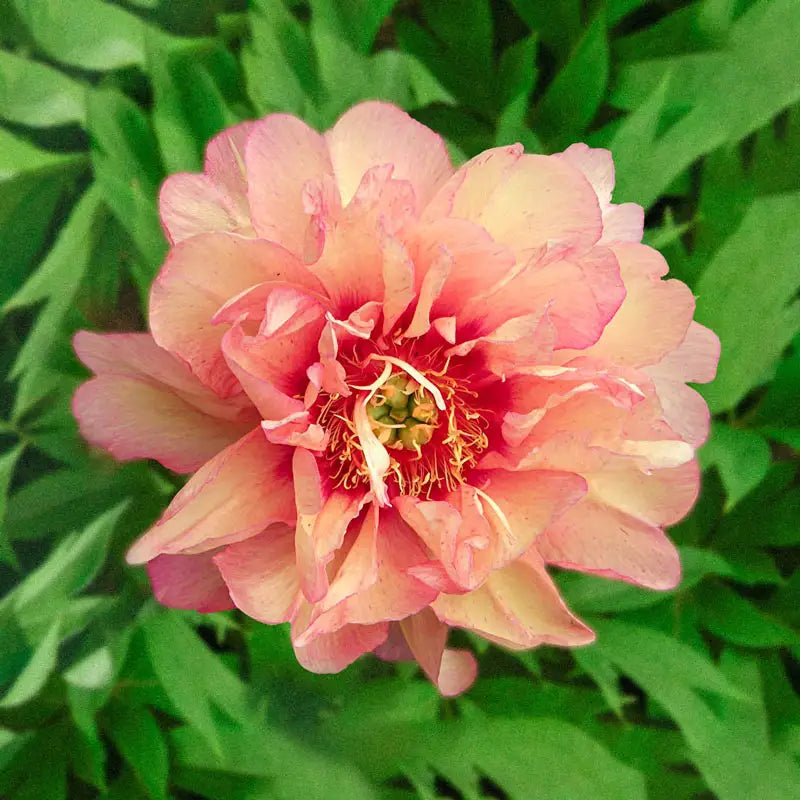 Drawing the eye from across the garden, these extraordinary 6-7" blooms showcase a mesmerizing copper-toned display, achieved through a sophisticated blend of red, yellow and orange petals. A cross between a bush peony and a tree peony, this robust Itoh variety stands up to 28" tall, with sturdy stems supporting multiple flowers well above its lush foliage. Perfect when planted along garden paths where its colour transitions can be appreciated up close, or mass-planted at the centre of deep borders for dramatic effect. The show continues into autumn as the foliage transforms into brilliant orange and red hues. Being naturally deer resistant and adaptable to most garden conditions, this peony delivers exceptional garden performance with minimal fuss, while its unique colouring makes it a standout choice for cut flower arrangements where blooms will gradually fade from vibrant orange-red to cream while maintaining their brassy centre.