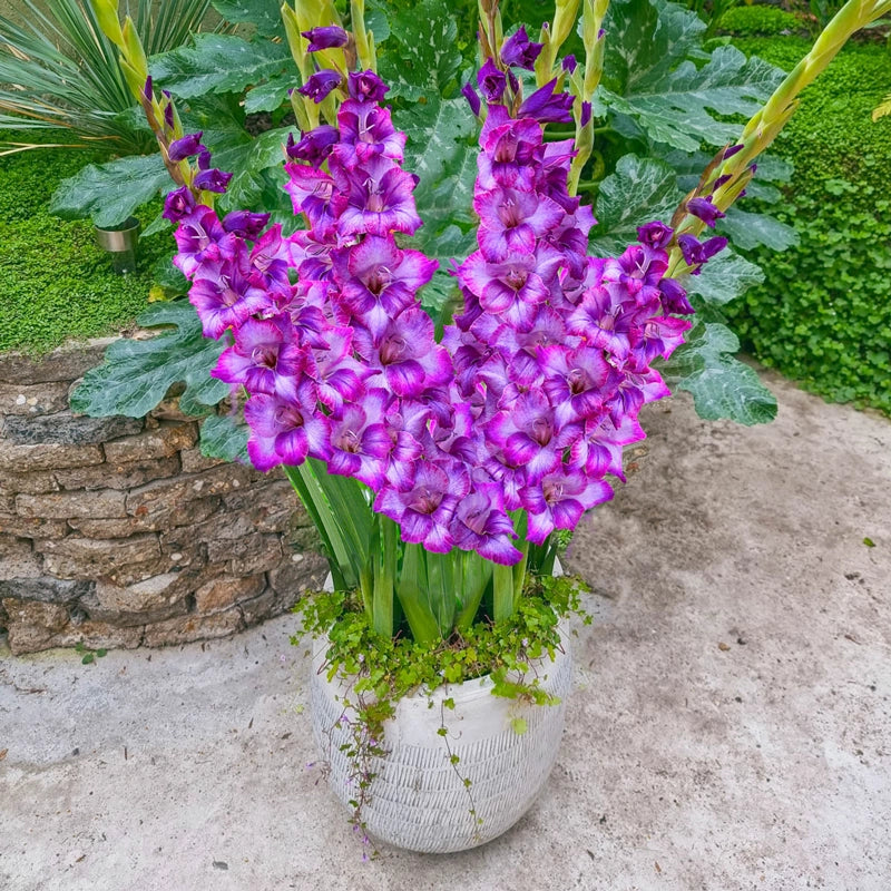 Compact spikes in varied blue-purple shades rise without staking and hold up to 20 full-size florets, creating strong seasonal impact in sunlit borders or containers. These early, long-flowering plants stay tidy, need little care and suit pathways, driveways or small urban spaces. Their extended bloom window enhances any sunny landscape.
