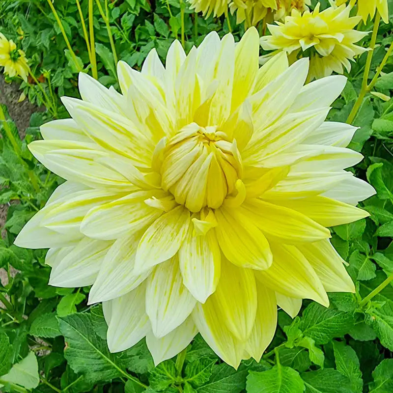 Enjoy a splash of warm, sunshiny colour from midsummer to frost! This extra-large, 10" dahlia bears a creamy yellow palette highlighted by bright yellow streaks. Makes a cheerful feature garden accent or cut-flower specimen. A true stunner!