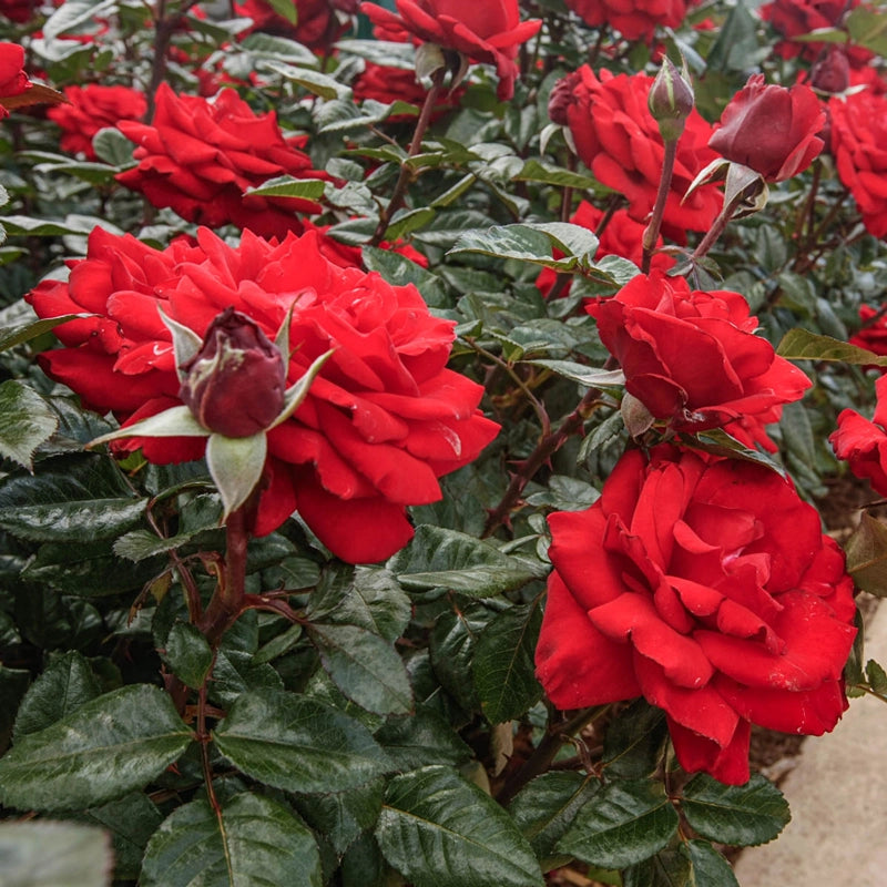 Massive and long lasting, Legends produces 5–8" ruffled double blooms with around 30 petals apiece. Each radiant red flower keeps its colour without fading, opening from classic, high-centred buds into full, rounded form. The rich foliage carries an unusual red green tint that highlights the blooms beautifully. With its robust height, strong stems and oversized leaves, this impressive specimen delivers unforgettable presence in the garden and in arrangements.