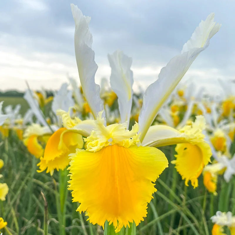 Frilled lemon-yellow falls with deeply serrated edges give this Dutch iris an unmistakable silhouette, while crisp white standards and golden markings add bright contrast. Lemon Shark’s unusual texture and vivid colour make it a standout in arrangements and a lively presence in the garden. Easy to grow and well suited for use in naturalized settings.