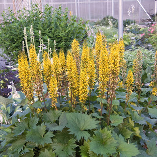 This clump-forming perennial boasts striking deep green leaves on sturdy black stems, creating an eye- catching ornamental base. In mid to late summer, slender spikes up to 6' tall rise above the foliage, adorned with vibrant golden-yellow blooms. These racemes attract butterflies and other pollinators, enriching your garden's biodiversity. Because the Leopard Plant tolerates "wet feet," it is perfect for areas near ponds or streams.
