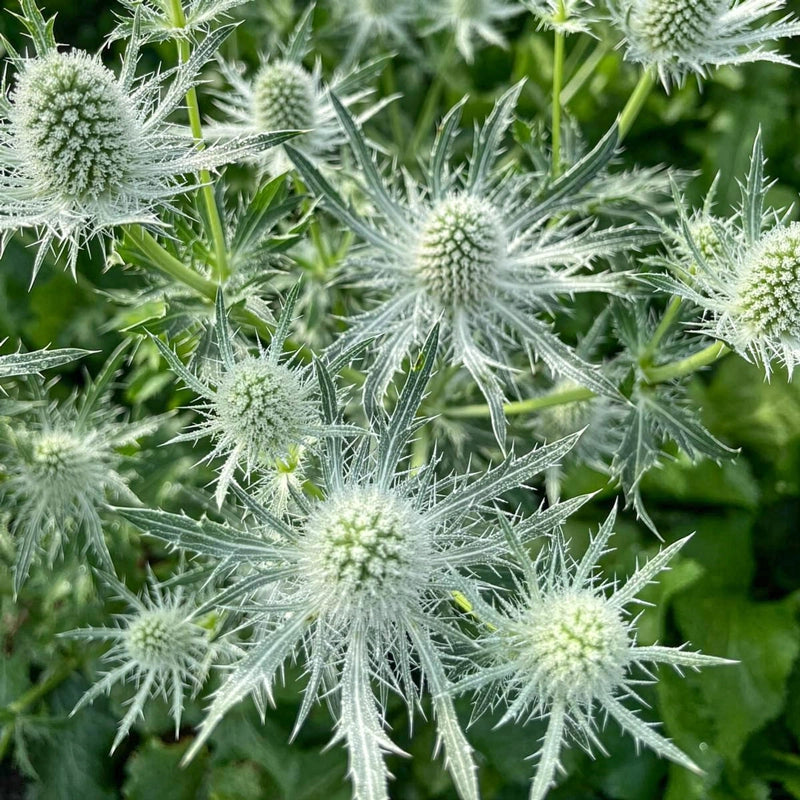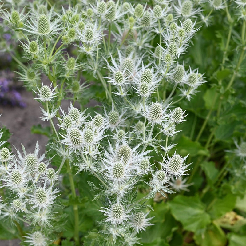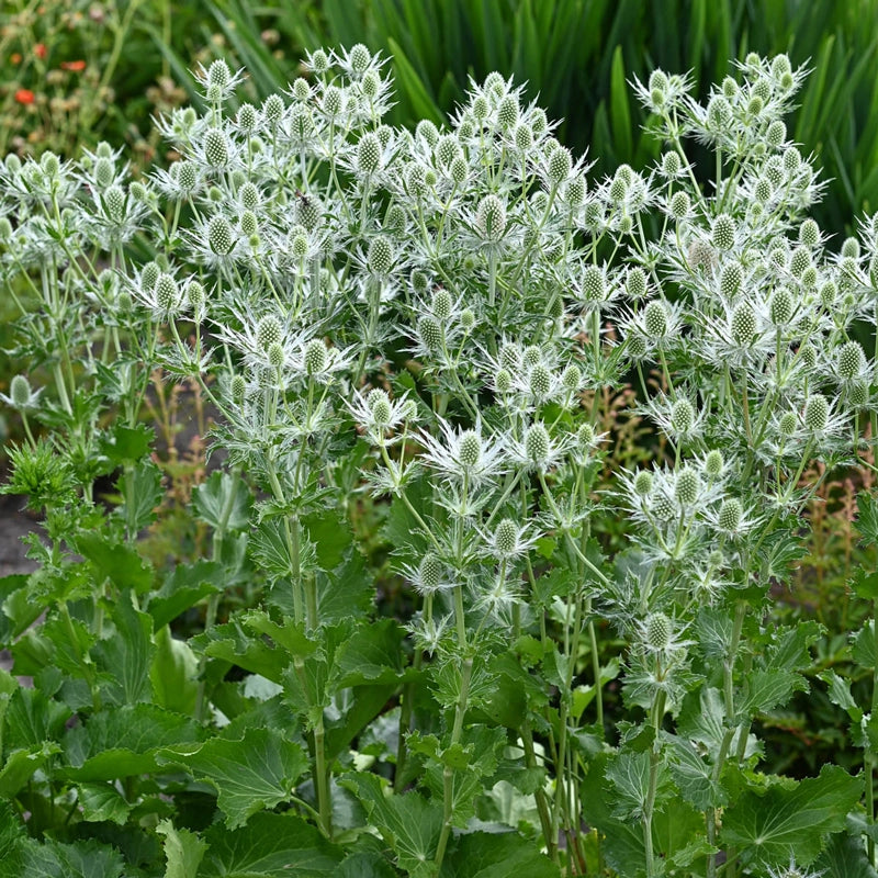 Tall, sculptural stems add structure and elegance to sunny borders while producing 2" thistle-like blooms ideal for fresh or dried arrangements. Silvery green, deeply lobed foliage provides definition before domed umbels open to crisp, pure white flowers in summertime. This drought-tolerant, salttough perennial thrives in well-drained soil. To enhance winter interest in your garden, resist cutting back the striking flower heads in autumn; instead, leave them to add structure through the colder months.