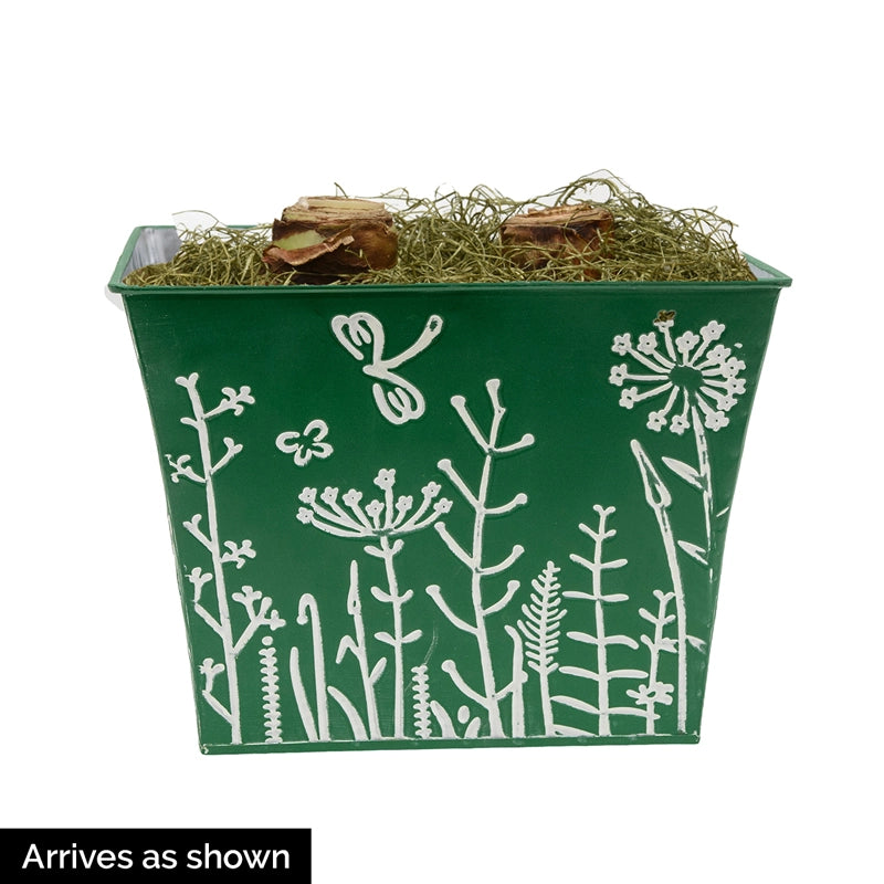 The billowy flowers float like puffy clouds above a deep emerald-green metal pot embossed with a sweet, simple nature scene, making this growing gift as lovely to give as it is to watch. EXCLUSIVE (6"h, 8½" dia.)