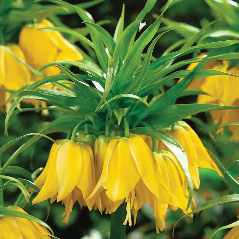 The towering spires of this crown imperial variety proudly display clusters of lemon-yellow, bell-shaped blooms, artistically dangling beneath a crown of foliage. This majestic flower not only enchants pollinators but also naturally deters deer and squirrels with its unique aroma. For a visually striking look, consider planting in clumps at the rear border, creating a vibrant backdrop.