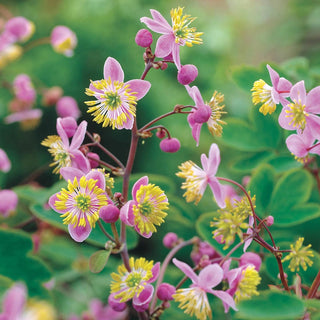 Rising gracefully with delicate sprays of lavender flowers set against striking blue-grey foliage, Meadow Rue creates a compelling garden focal point. The lacy, columbine-like leaves create a perfect backdrop for the floating flowers, whose conspicuous yellow stamens attract bees and butterflies. The purple-black stems add dramatic contrast, while the ferny foliage maintains interest even when not in bloom. Tolerates drought.