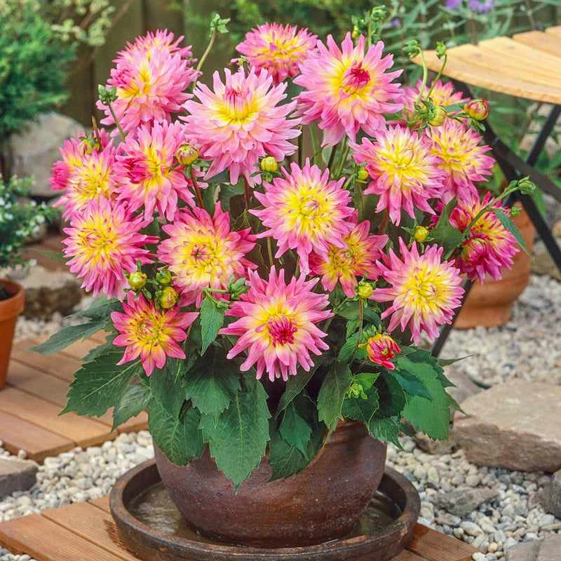 This sturdy, freely branching dahlia produces a bounty of textured, 5½" blooms adorned with semi-spiky petals. The cheery flowers are pink with cream-yellow centres. Melody Gipsy’s compact growth makes it well suited for containers and borders.