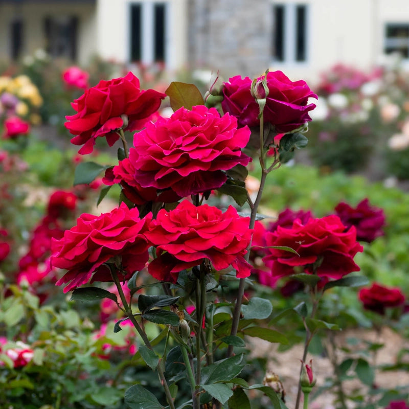A historic American milestone in red roses that's still hard to beat. The large pointed buds and rich red well-formed blooms have a velvety quality that you must feel to believe. The powerful damask rose fragrance seduces even the hardest heart. Vigorous, tall and proud with long stems and dark green leaves.