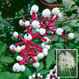 Panicles of fluffy white flowers in late spring give way to fascinating white berries held aloft by ruby-red stems in summer. Mounded, blue-green foliage makes a lush backdrop in shady spaces. Attracts pollinators!