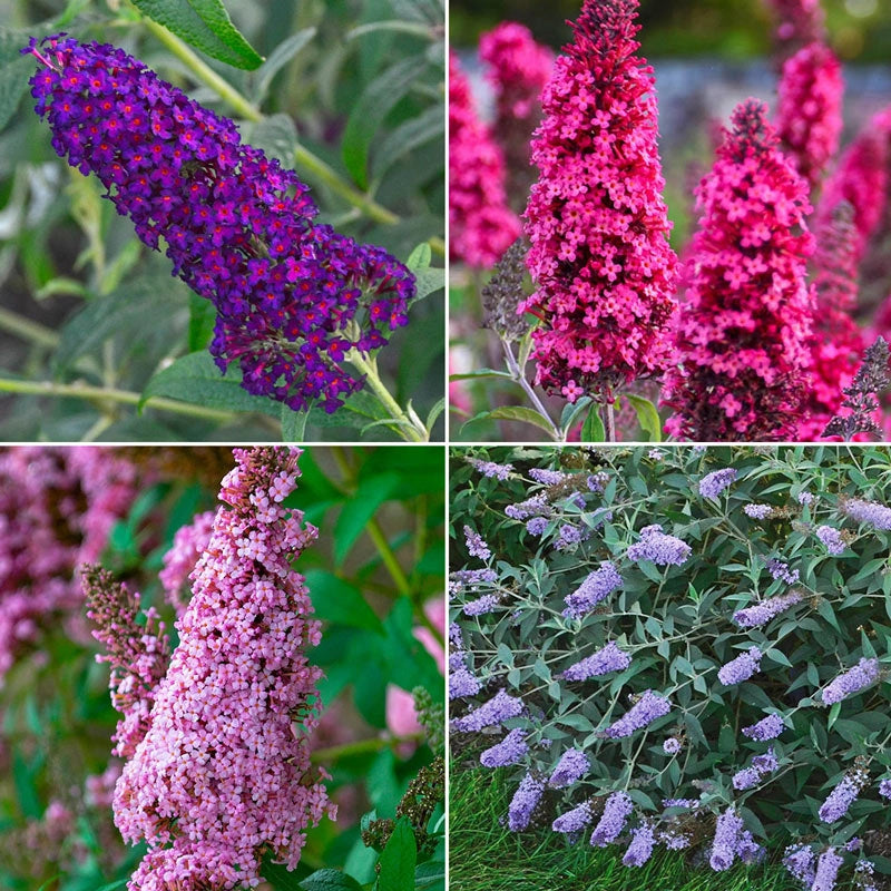 When it comes to sheer flower power, nothing beats buddleia, commonly known as the butterfly bush—and this MONARCH Butterfly Bush Collection features four of the best. These fastgrowing, sun-loving plants not only attract lots of butterflies and hummingbirds for months on end, they yield large, fragrant panicles from late summer to fall, making them some of the longest-blooming shrubs you can find.