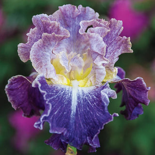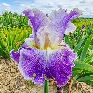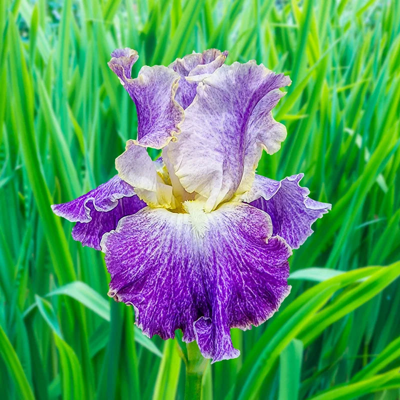 Breathe new life into your early spring garden with an iris that blooms abundantly before most others. This luminous, ruffled wonder boasts a striking interplay of cool colours. Rich lavender- violet washes over the white standards, while the falls echo the tones with a touch more depth. Greenish-yellow edges frame the blooms. Expect a staggering 9-10 blooms per stem! Pairs beautifully with white neighbours like Immortality.
