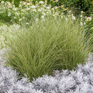 Morning Light Maiden Grass features narrow leaves with white variegated margins that catch the light, creating a shimmering effect in the breeze. This variegation adds depth and texture to your garden, making it a focal point throughout the growing season. Its subtle beauty complements many garden styles and pairs well with both bold and pastel blooms.