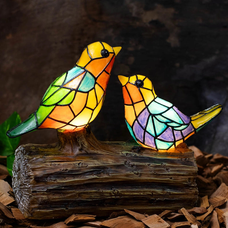 Inspired by stained glass, this colorful pair of birds glows warmly after sunset. Mosaic-style panels catch the light by day, then shine softly from within at night thanks to a hidden solar panel. A welcoming touch for garden beds, pathways or patios. Crafted of weather-resistant resin for lasting outdoor enjoyment. Requires one AAA battery (included). (6¾"h, 9"w)