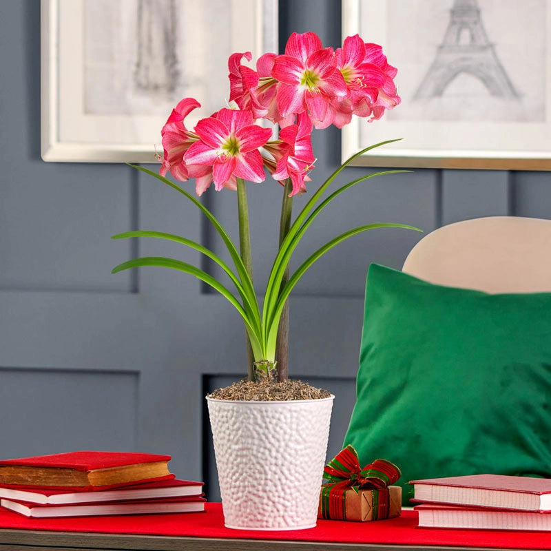 Neon Amaryllis adds bold color at a time when landscapes are barren and thoughts of spring are still so far away. Watch as this live Amaryllis gift pops with electrifying magenta pink to red flowers brushed with icy white. The eye-catching, flared blooms reach nearly 6" wide atop 20-24" stems. Each bulb produces up to 12 flowers, and will bloom in following years with proper care. Your Amaryllis bulb comes pre-planted in a lovely white, textured pot suitable for gift giving. (6¼"h, 6¼" dia.) EXCLUSIVE