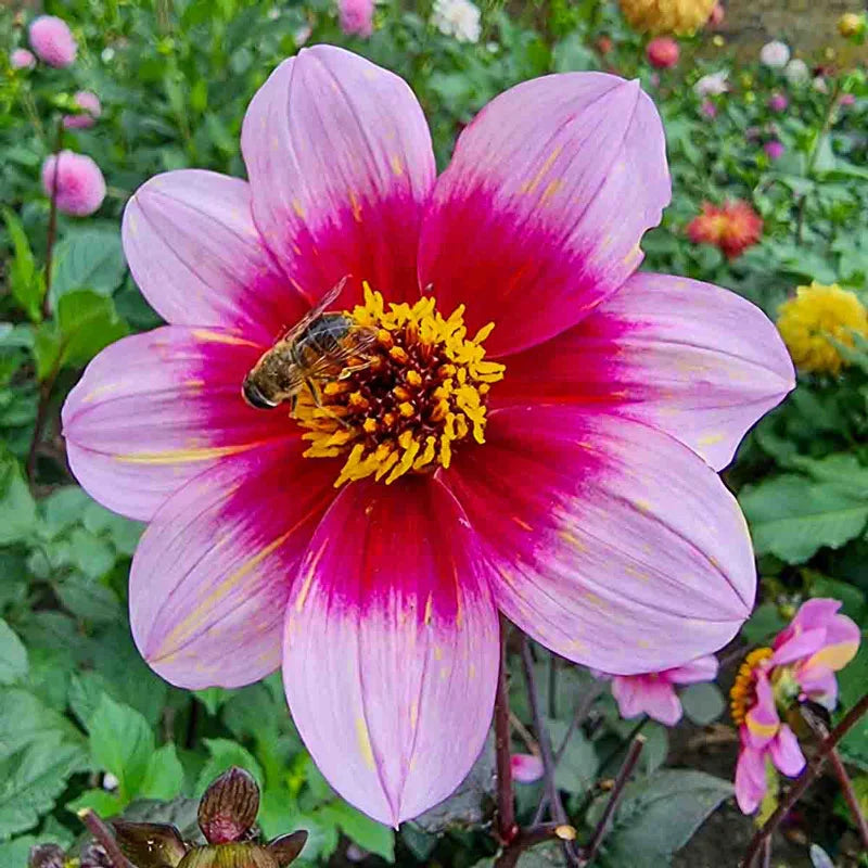 Bright magenta-pink petals streaked with yellow and ringed by a vivid red halo give this single flowered dahlia a truly electric presence. The dark, almost black foliage only heightens the effect. The compact 3½" blooms bring energy to cutting gardens and borders.