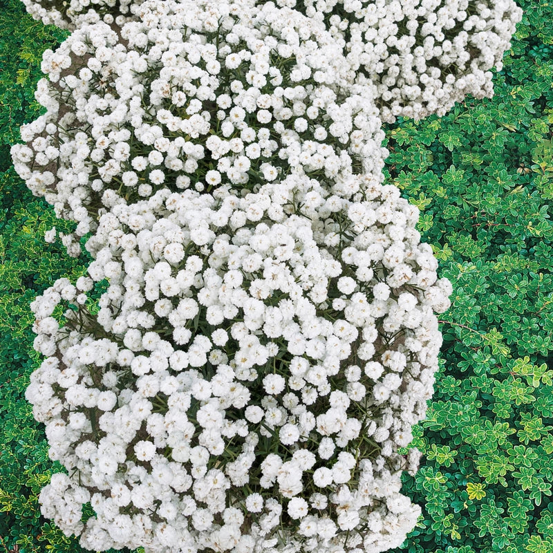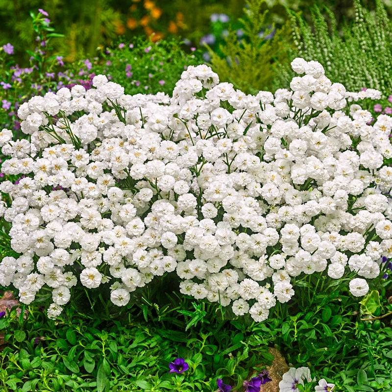 Bright snowy white, double flowers measuring about ½" across blanket this yarrow in dense clusters from early summer well into fall. The plant forms a neat, dome-shaped mound that stays compact, making it ideal for the front of sunny borders where space is limited. Exceptionally drought tolerant once established, it flourishes in well-drained soil and shrugs off heat with ease. Pollinators flock to the long-lasting blooms, while deer tend to leave it alone, ensuring reliable colour with minimal upkeep.
