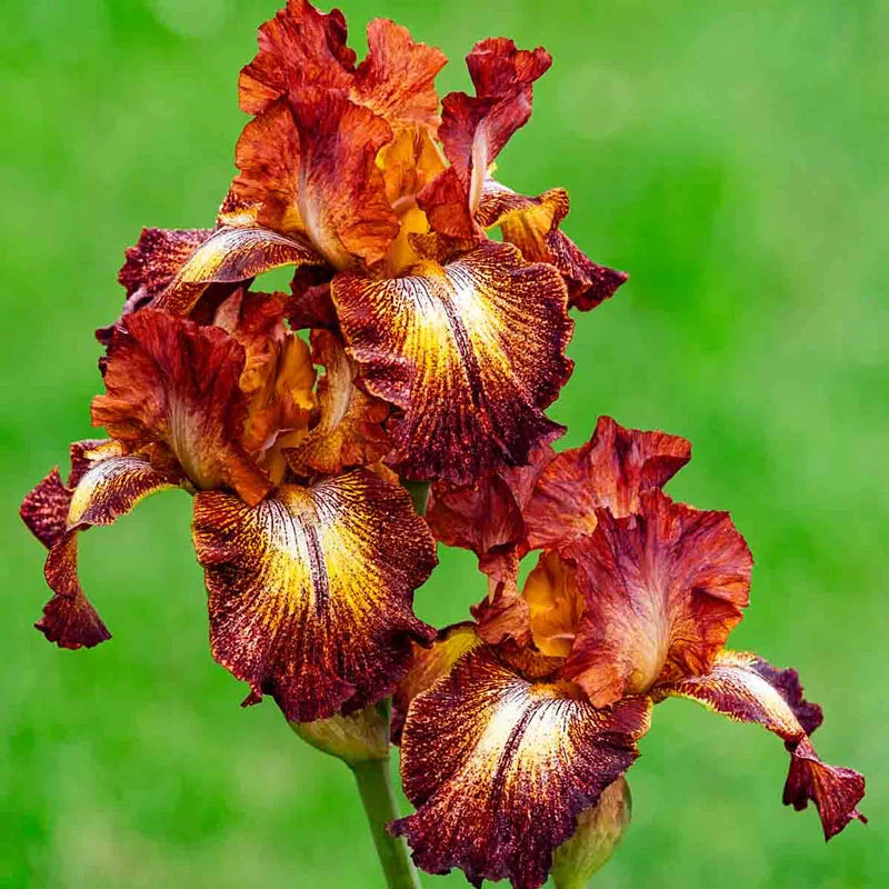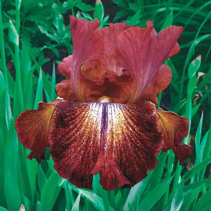 Lightly ruffled, reddish-brown petals have a creamy yellow centre highlighted by bright orange beards. Very early flowering. Reblooms late summer to early fall.