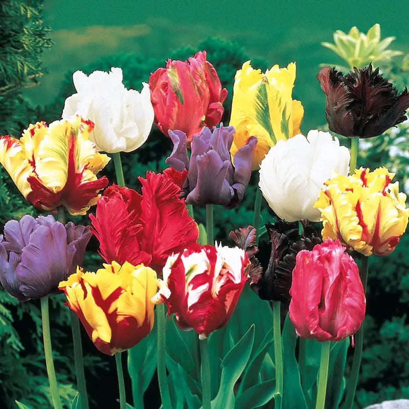 These flamboyant, feathery-petalled Parrot Tulips command attention in any garden or bouquet. Big, vibrant flowers with incised, fringed petals create the atmosphere of a tropical wonderland filled with birds of brilliant plumage. Colour coordinated for the most vivid display. Varieties are not individually labeled.