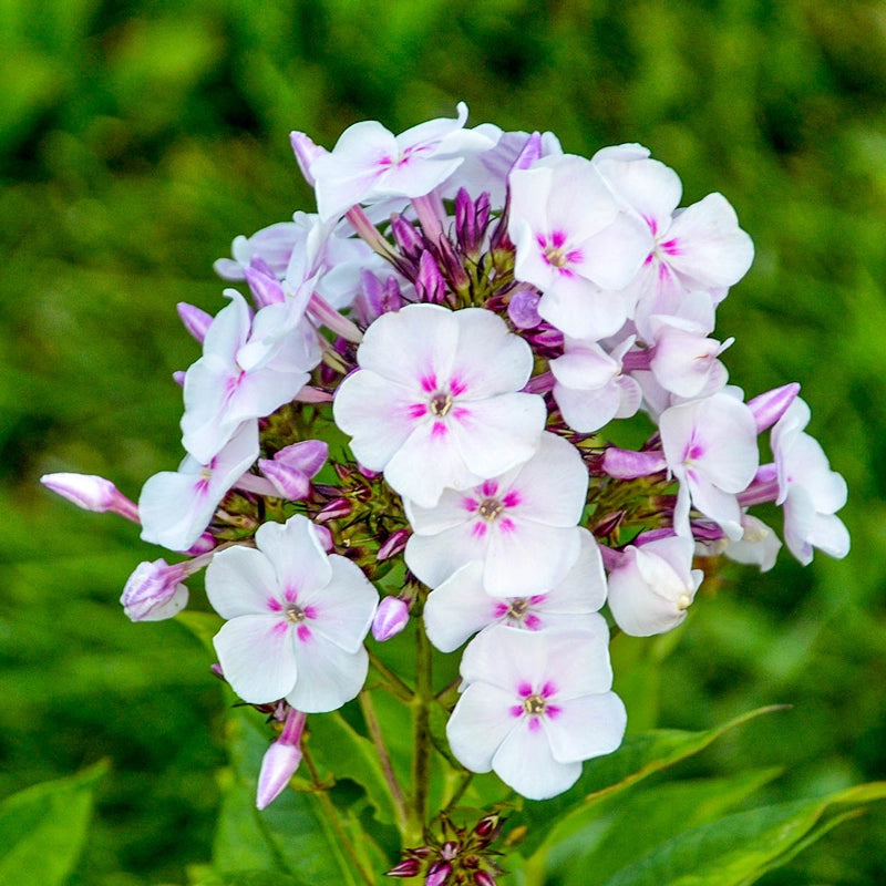 This compact garden phlox carries dense, 6–8" pyramidal panicles of fragrant white flowers, each about 1" across with a soft pink star at the centre. Rich in nectar, the summer display attracts bees, butterflies and other pollinating insects. Dark green stems and clean, bright green foliage stay attractive even in heat and humidity. Party Girl’s strong resistance to powdery mildew helps keep the bloom clusters looking fresh through the season.